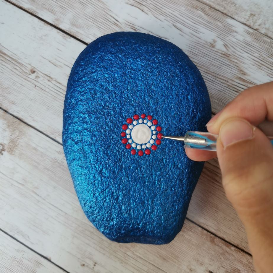 In the instructions you can see which tools to choose from the dot set. Dip the stick lightly into the paint and place it on the pebble. The more often you place the stick on the pebble, the smaller the dot will be.